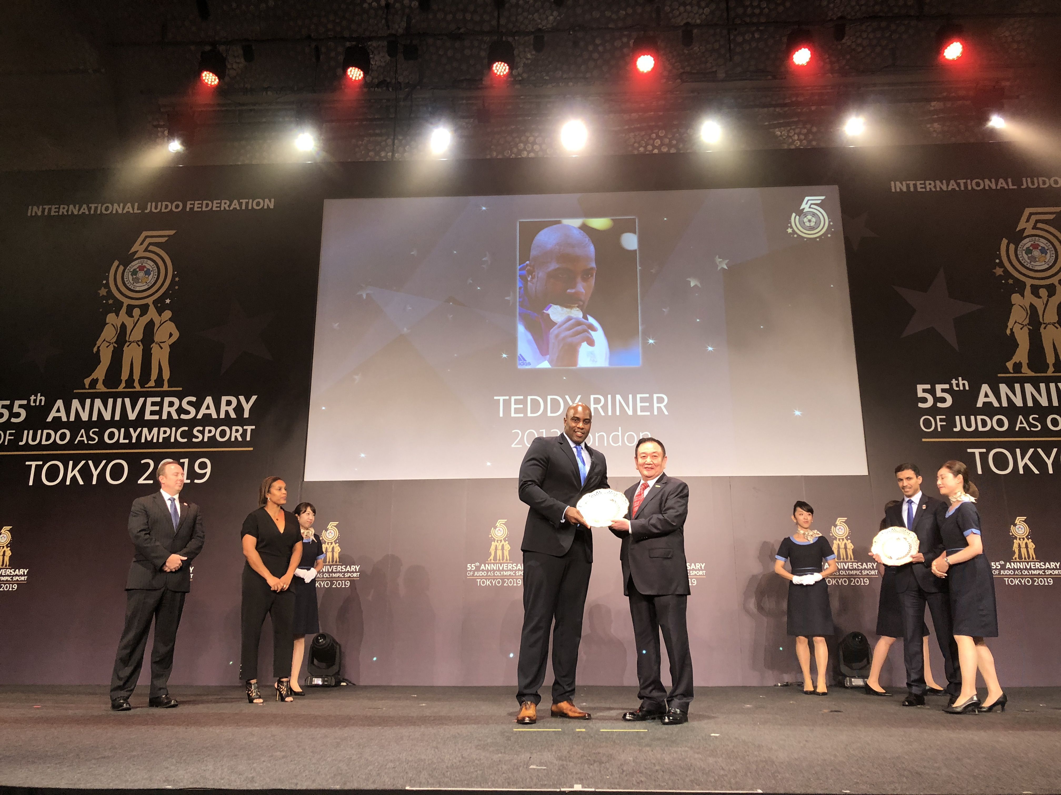 8月23日,在2019年世界柔道錦標賽開賽前,國際柔道聯合會在日本東京舉行慶典活動,紀念柔道運動作為奧林匹克運動項目55周年這一歷史時刻。儀式上,國際柔道聯合會將近60年來為世界柔道運動做出貢獻的運動員與組織機構頒發獎項。泰山體育產業集團作為國際柔道聯合會頂級合作伙伴受邀出席,董事長卞志良作為特邀嘉賓為倫敦奧運會最佳男運動員Mr. Teddy Riner,倫敦奧運會最佳女運動員Mrs. Lucie Decosse 頒獎。