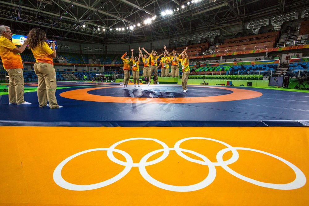 2016年8月18日,在里約奧運會摔跤場館內(nèi),場館工作人員和志愿者在摔跤墊上合影留念,這屆奧運會的摔跤墊來自中國山東泰山體育集團(tuán)。新華社記者劉彬攝