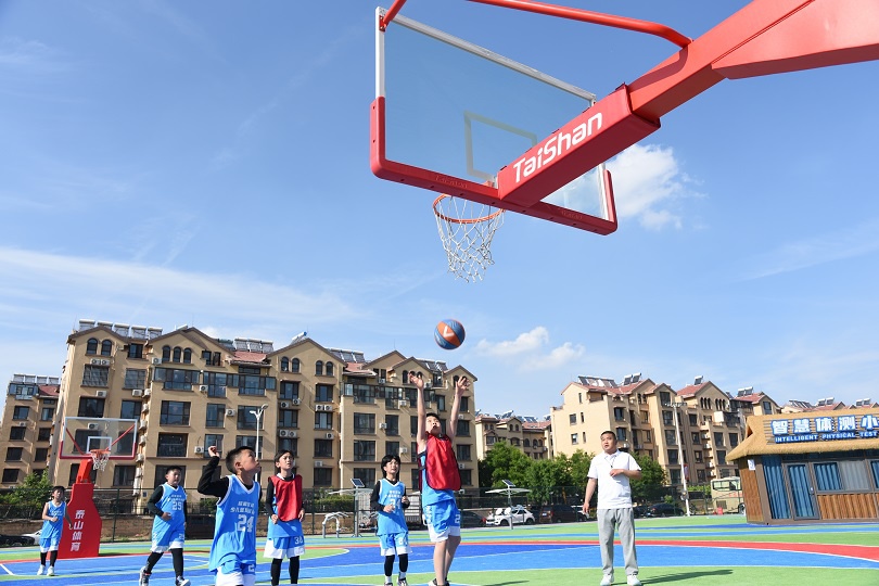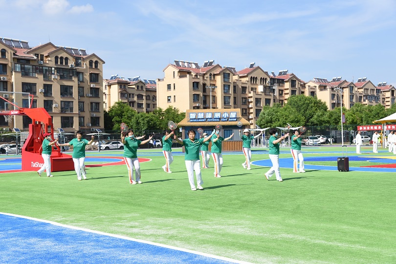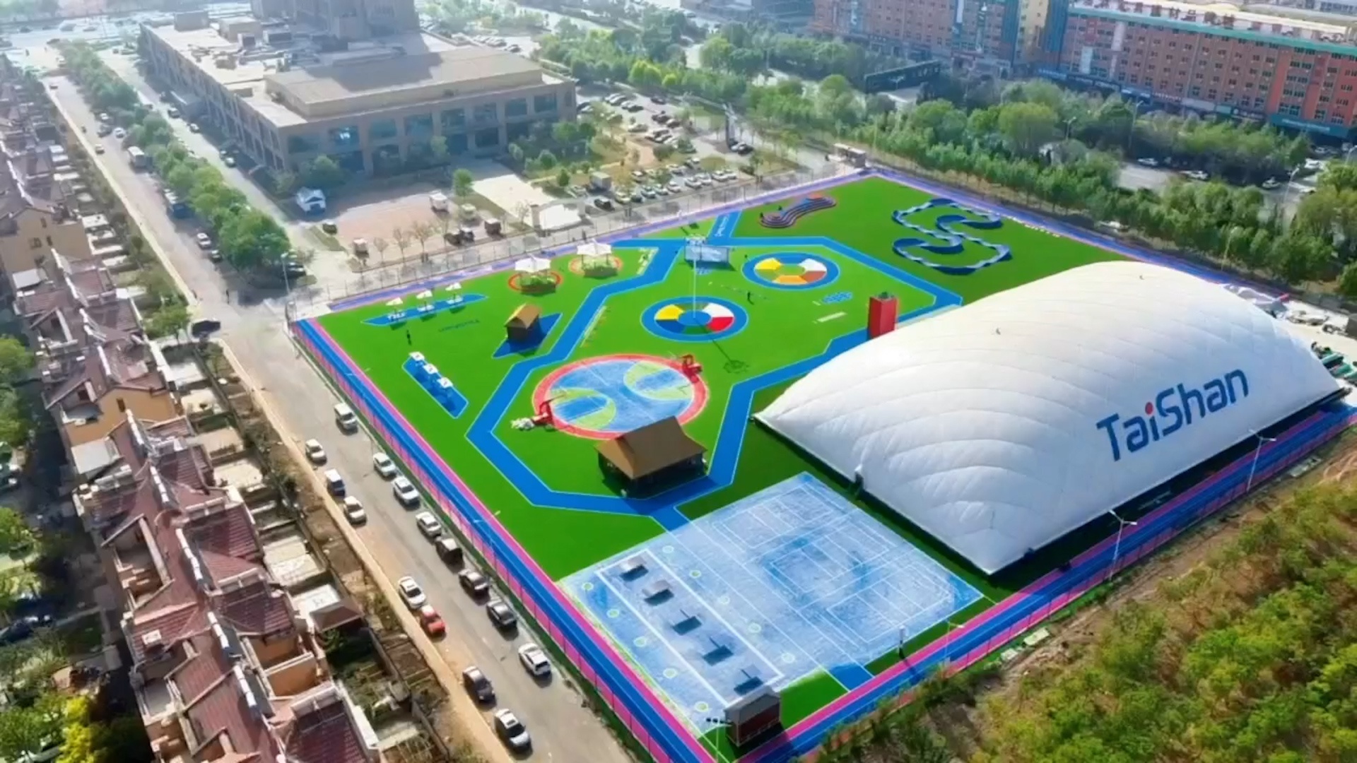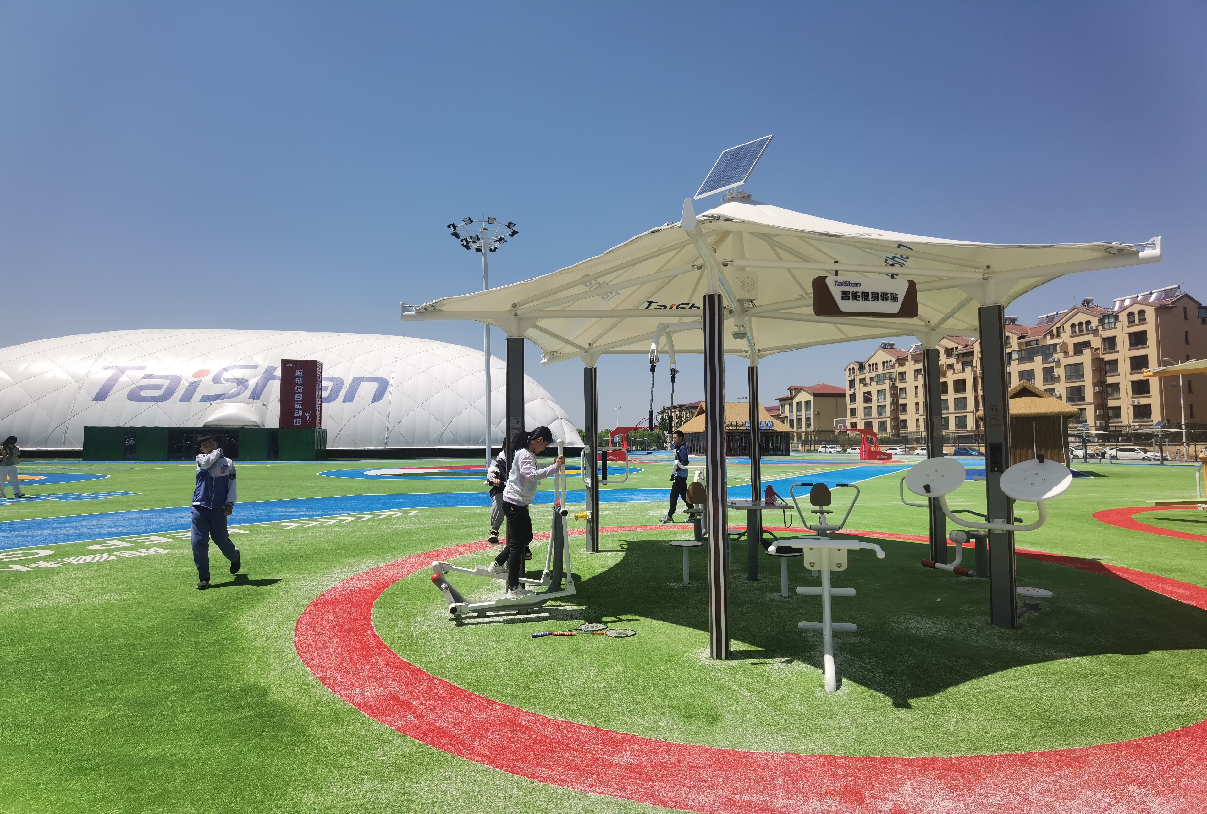在場地鋪設上,均采用泰山新材料功能人造草鋪設,全方位保證運動安全和環保;氣膜式籃球綜合運動館,內部設置2片籃球場、6片乒乓球場地及1片網球場。網球場同時套線4個羽毛球場地。場館內可以滿足體育運動,體育教學及群眾比賽需求。從場館到運動超市、智慧體測小屋,全部采用可裝配式建筑。